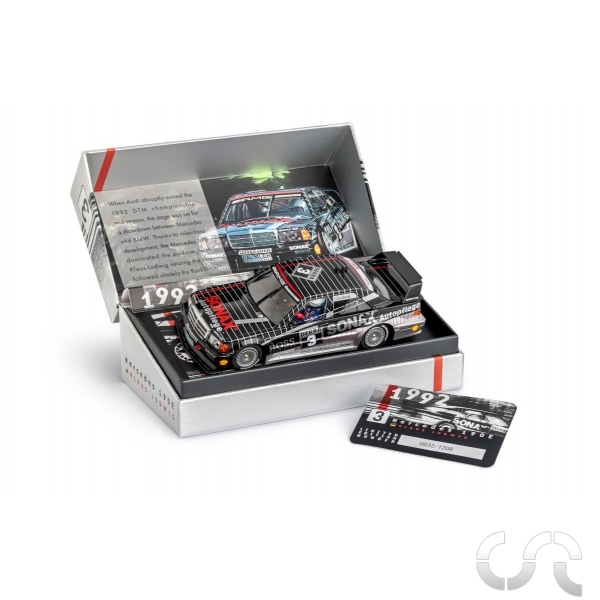 | Description: | Coffret Winner DTM Mercedes 190E N°3 engagé par l'écurie "AMG‑Motorenbau GmbH (Mercedes‑AMG Works Team)". Résultat: Vainqueur. - Moteur MX15 V12/4 (21.000 tours par minute / 150g) en position Inline. - Support moteur Inline: CH110 - Couronne 28d: Gi28BZ - Pignon 9d: Pi09 - Jantes AR: W15808215A - Jantes AV: W15808225P - Pneus AR: PT1228C1 - Guide: CH66 - Poids: 74gr - Véhicule équipé d'origine avec les pièces détachées de compétition de la marqueLa Mercedes 190 E Evo II n° 3 a été confiée à l’expérimenté pilote allemand Klaus Ludwig. Il a utilisé cette voiture pour remporter plusieurs courses lors de la saison 1992 du DTM, notamment un doublé au meeting de Diepholz le 16 août 1992. Cette performance s’inscrit dans une série dominante : Mercedes AMG a remporté 16 des 24 courses au cours de cette saison, et Klaus Ludwig remporte le titre pilote, tandis que l’écurie décroche le titre constructeur. Cette voiture a joué un rôle clé dans la suprématie de Mercedes dans les tours DTM cette année-là..