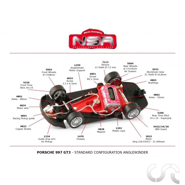 | Description: | Porsche 997 " John Player Special Livery " N°7. - Moteur cage longue 21400 t/mn , couple : 350 gr /cm, référence : (NSR3023) - Moteur en position anglewinder vissé sur son support - Pignon en laiton :13 dents (référence : 7113) - Couronne :31 dents , en aluminium vissée diamètre: 16.8 mm (référence 6531) - Support moteur anglewinder fixé par 3 vis (référence : 1259) - Paliers laiton - Axe arrière en acier trempé et rectifié diamètre: 2.38 mm , longueur 55 mm - Axe avant en acier trempé et rectifié diamètre: 2.38 mm , longueur 48 mm - Possibilité de régler la hauteur de l'axe avant - 2 jantes arrières en aluminium vissées diamètre: 17 x 10 mm (référence : 5004) - 2 jantes avants en aluminium vissées diamètre: 17 x 8 mm (référence : 5003) - 2 pneus arrières Supergrip , diamètre : 19 x 10 mm (référence : 5206) - 2 pneus avants: diamètre : 18 x 8 mm (référence : 5226) - Aimant rond au néodymium positionné devant le moteur , diamètre 8 x 5 mm - Fil moteur-guide très souple avec gaine en silicone - Guide clipsé à grand débattement angulaire monté sur un bras articulé triangulaire , dit "drop arm" - Poids: 80gr - Les vis M2.5 des roues et de la couronne nécessitent une clé Allen ou un tournevis avec un embout Allen de 1.3 mm Entièrement équipée des pièces détachées de compétition de la marque: |