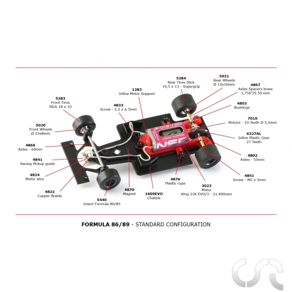 La Formule 86/89 est disponible en configuration INLINE, avec moteur KING 21 EVO/3. La transmission est 10-27. Il y a un nouveau support moteur, qui peut fonctionner sur 5 points de fixation, à la description des pilotes. NSR suggère d'utiliser uniquement la configuration d'origine qui est la meilleure dans beaucoup de situation (point de fixation avant + les deux côtés. Pas d'utilisation des deux arrières). Les jantes en aluminium disposent de la technologie AIR SYSTEM, avec des pneus tendres, offrant une adhérence exceptionnelle sur tout type de surface de piste.