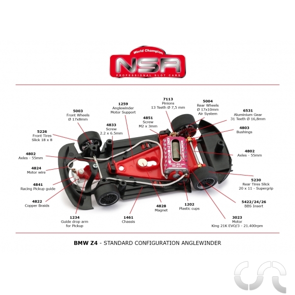 | Description: | BMW Z4 GT3 " Martini Racing Grey " N°24. - Entièrement équipée des pièces détachées de compétition de la marque - Moteur King 21400 rpm (350gr/cm) en position Anglewinder (NSR3023) - Couronne 31d: NSR6531 - Pignon 11d: NSR6911A - Axe avant ajustable - Jantes AV aluminium: NSR5003 - Jantes AR aluminium: NSR5004 - Guide "Drop arm extra hard: NSR1234 - Axe AV/AR: 55mm: NSR4802 - Pneus Av: 16x8mm (NSR5226) - Pneus Ar: 20x11 (NSR5230) |
