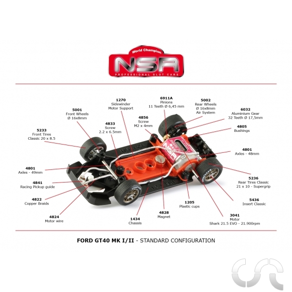 | Description: | Forrd GT40 N°60 ayant participé aux 24h du Mans en 1966 , engagé par l'écurie " Essex Wire Corporation (USA) ". Résultat: Abando (Moteur). - Moteur NSR 3041 – Shark 21900 rpm Cage courte - Support moteur Sidewinder - Chassis : NSR1434 - Pignon NSR6911A - Couronne NSR6032 - Jantes arrière: NSR5002 - Jantes avant: NSR5001 - Pneus arrière: NSR5236 - Pneus avant: NSR5233 - Hauteur de l'essieu avant peut être réglée à l'aide des vis NSR. - Les vis M2.5 des roues et de la couronne nécessitent une clé Allen ou un tournevis avec un embout Allen de 1.3 mm. Véhicule entièrement équipée des pièces détachées de compétition de la marque