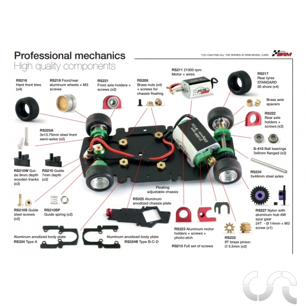 | Description: | BMW 2002 Ti " Marlboro " N°69. - Moteur cage courte anglewinder vissé sur son support de 21000 t/mn - couple: 200 gr/cm (RS211) - Pignon en laiton: 9 dents (RS232) - Couronne: 24 dents, diamètre 14 mm, moyeu aluminium vissé (RS227) - Châssis métal en 2 parties - Possibilité de régler le jeu entre les 2 parties - Axes AR pleins de 3 mm de diamètre. longueur: 46 mm reposant sur 2 roulements à billes intégrés à des supports en laiton (RS224) - Supports d'axes avants et arrière en laiton, vissés - 2 demi axes avants, longueur: 12.75 mm sur paliers laiton (RS225A) - Bagues de jeu latéral d'axe en laiton - 2 jantes arrière en aluminium vissées avec sur la surface une rainure décentrée de diamètre: 11.4 x 8.1 mm (référence : RS218) - 2 jantes avant en aluminium vissées avec sur la surface une rainure décentrée de diamètre: 11.4 x 8.1 mm (référence : RS218) - 2 pneus arrières, 30 shore (référence RS217), mesures CDL sur jante: diamètre : 17 x 8.5 mm - 2 pneus avants (référence RS216), mesures CDL sur jante: diamètre : 17 x 8.5 mm - Puits de guide en aluminium - Guide piste vissé muni d'un ressort dans l'axe - Livré avec 1 guides + 1 aimant muni d'un scotch double face, dimensions: 25 x 8 x 3.2 mm -Poids: 86gr les vis M3 , des roues , de la couronne et des supports moteur , nécessitent une clé Allen ou un tournevis avec un embout Allen de 1.5 mm |