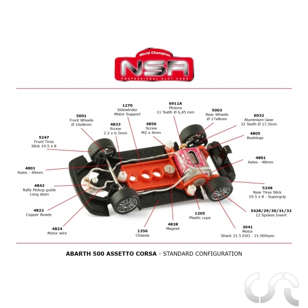 | Description: | Abarth 500 " Rothmans Livery " Red N°17. - Moteur cage courte 21900 t/mn -couple : 164 gr /cm. Shark , référence: (NSR3041) en position sidewinder vissé sur son support - Pignon en laiton 11 dents (référence : NSR6911A) - Couronne 32 dents en aluminium vissée, diamètre: 17.5 mm (référence: NSR6032) - Support moteur sidewinder fixé par 3 vis (référence : NSR1270) - Axe arrière sur paliers laiton (référence: NSR4805) - Axes en acier trempé et rectifié, diamètre: 2.38 mm , longueur 49 mm (NSR4801) - Possibilité de régler la hauteur de l'axe avant - 2 jantes arrières en aluminium vissées, diamètre: 17 x 8 mm (référence : NSR5003) - 2 jantes avants en aluminium vissées, diamètre: 17 x 8 mm (référence : NSR5001) - 2 pneus arrières diamètre: 19.5 x 8 mm (référence : NSR5248) - 2 pneus avants diamètre: 19.5 x 8 mm (référence : NSR5247) - Aimant rond au néodymium positionné devant le moteur - Fil moteur-guide très souple avec gaine en silicone - Guide clipsé à grand débattement angulaire (référence: NSR4842) |